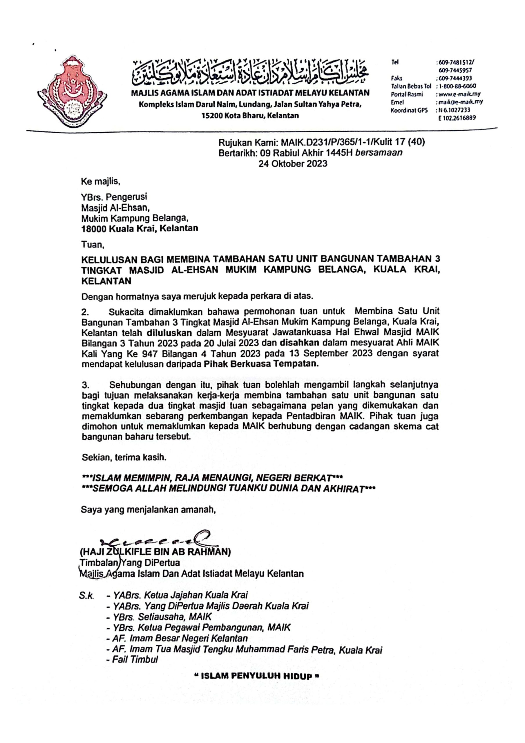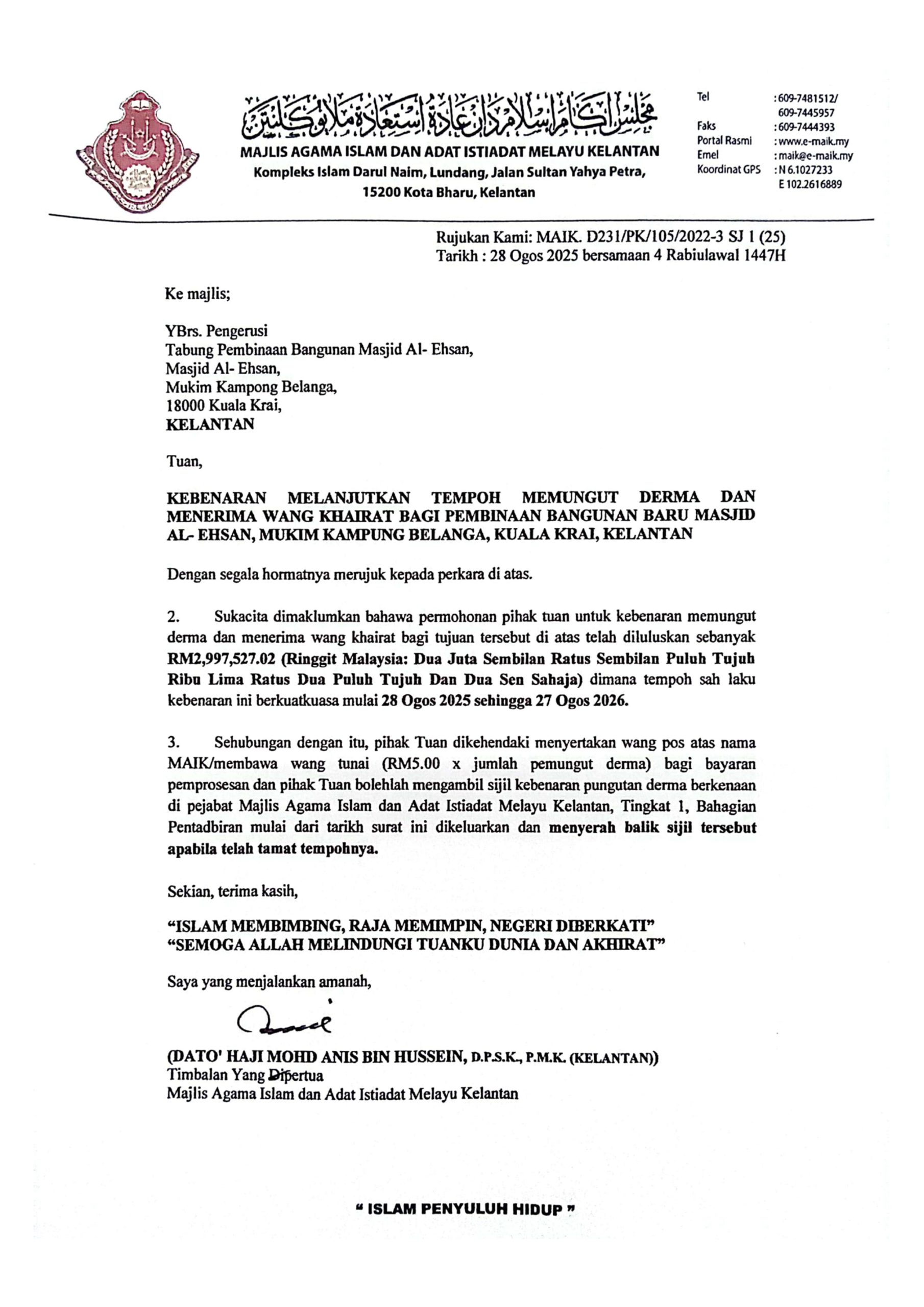 Projek pembinaan Masjid Al-Ehsan ini telah mendapat sokongan rasmi daripada Majlis Agama Islam dan Adat Istiadat Melayu Kelantan (MAIK).
